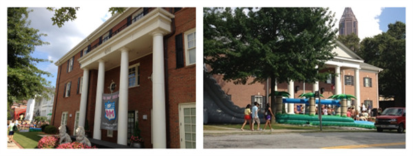 美国的学生社团与我国也有所不同。他们的本科团体通常以2、3个希腊字母来命名,称为兄弟会或姐妹会;各自拥有一套自己的会员选拔方式,会员之间的关系比较亲密,常常互帮互助,让人新奇的是,他们的会员身份不会随毕业而改变。佐治亚理工学院有多幢独立别墅式楼房,提供给各兄弟会或姐妹会作为活动场馆(图4),每年8月新学年伊始,各场馆门口都会布置一新,以吸引新生的注意。
