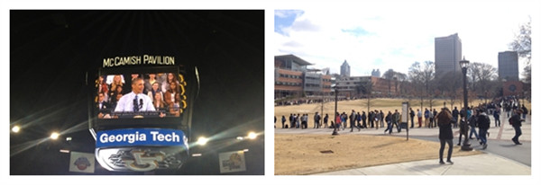 在访学期间,我参加了地震工程研究协会佐治亚理工分会,担任副主席一职,并积极参与社会公益和拓展活动。2014年10月至12月,我随同协会分别赴Roswell North小学、Nickajack小学、Fernbank自然历史博物馆(图5)进行公益宣传和专业展示等。此外,还有幸聆听了多场讲座和报告,诸如佐治亚理工学院荣誉校长G. Wayne Clough题为“从始新世到人类世——从工程师的角度看待气候变迁”的报告等。2015年3月,美国总统奥巴马访问佐治亚理工学院,并发表了关于倡导学费改革的演讲(图6)。为一睹总统风采,佐治亚理工学院内排起了长长的领票队伍,这一景象在地广人稀的美国较为罕见,也不禁让人感慨:对于名人的追捧其实全世界都一样。