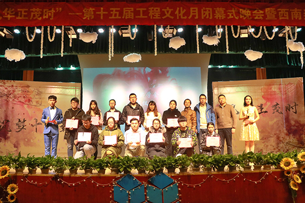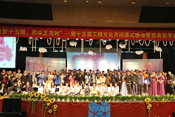 2017年12月23日星期六晚18:30,以“筑梦十五载,风华正茂时”为主题的第十五届工程文化月闭幕式晚会暨西南奖学金颁奖典礼在图信报告厅隆重举行。杭州市西南建设工程检测有限公司副总经理应志杰先生、副总经理祝世昌先生、工程学院党委书记谷波权老师、工程学工办老师、各分院学生会主席、历届团委学生会主席团及部长团成员出席了本次晚会,与现场六百余名观众共同度过了一个难忘的夜晚。